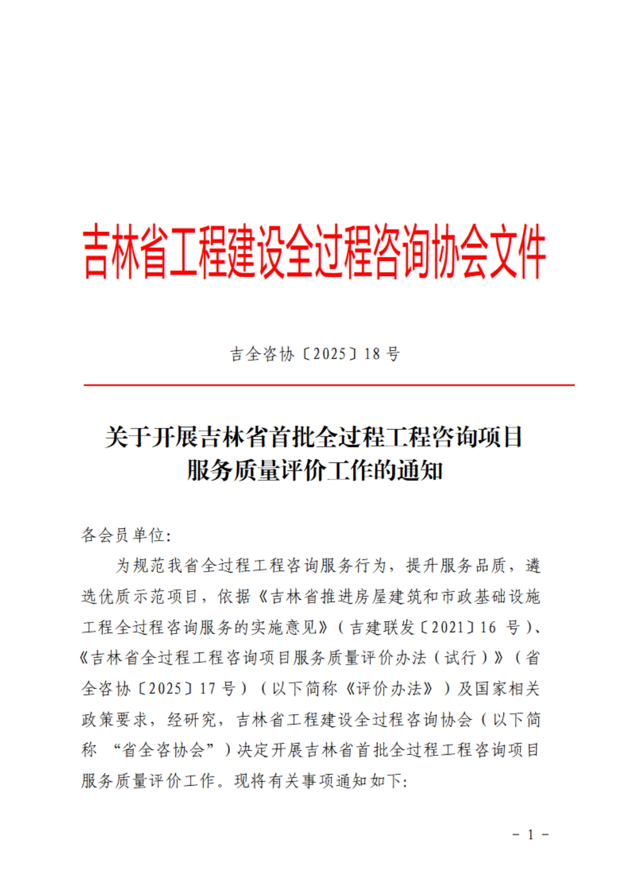 关于开展吉林省首批全过程工程咨询项目服务质量评价工作的通知